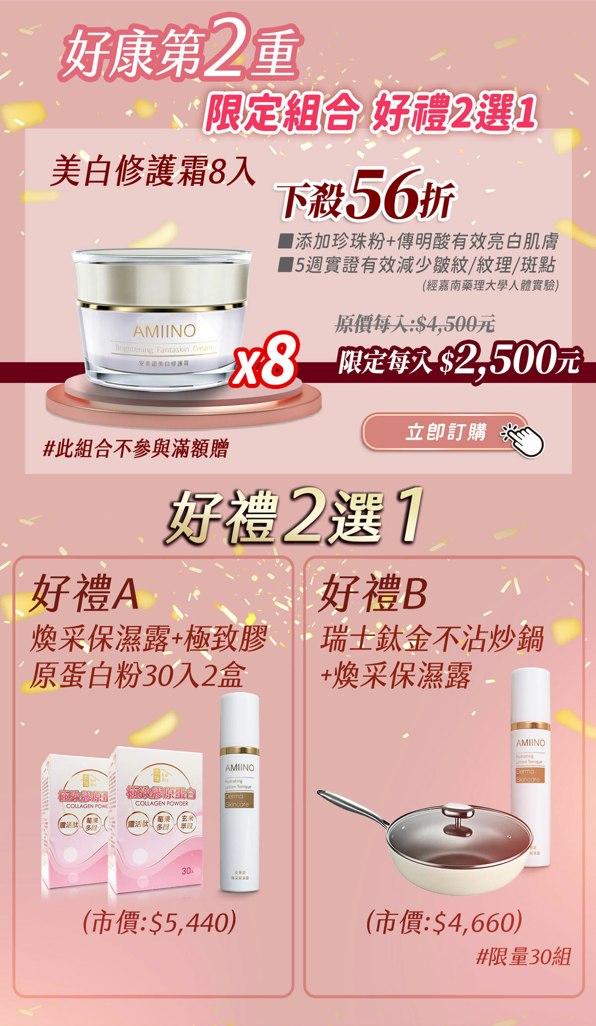 ※限定組合2-美白修護霜8入組56折 好禮2選1 煥采保濕露+膠原蛋白30入2盒 或 煥采保濕露+瑞士鈦金不沾炒鍋(不參與滿額贈、贈品有限售完為止)