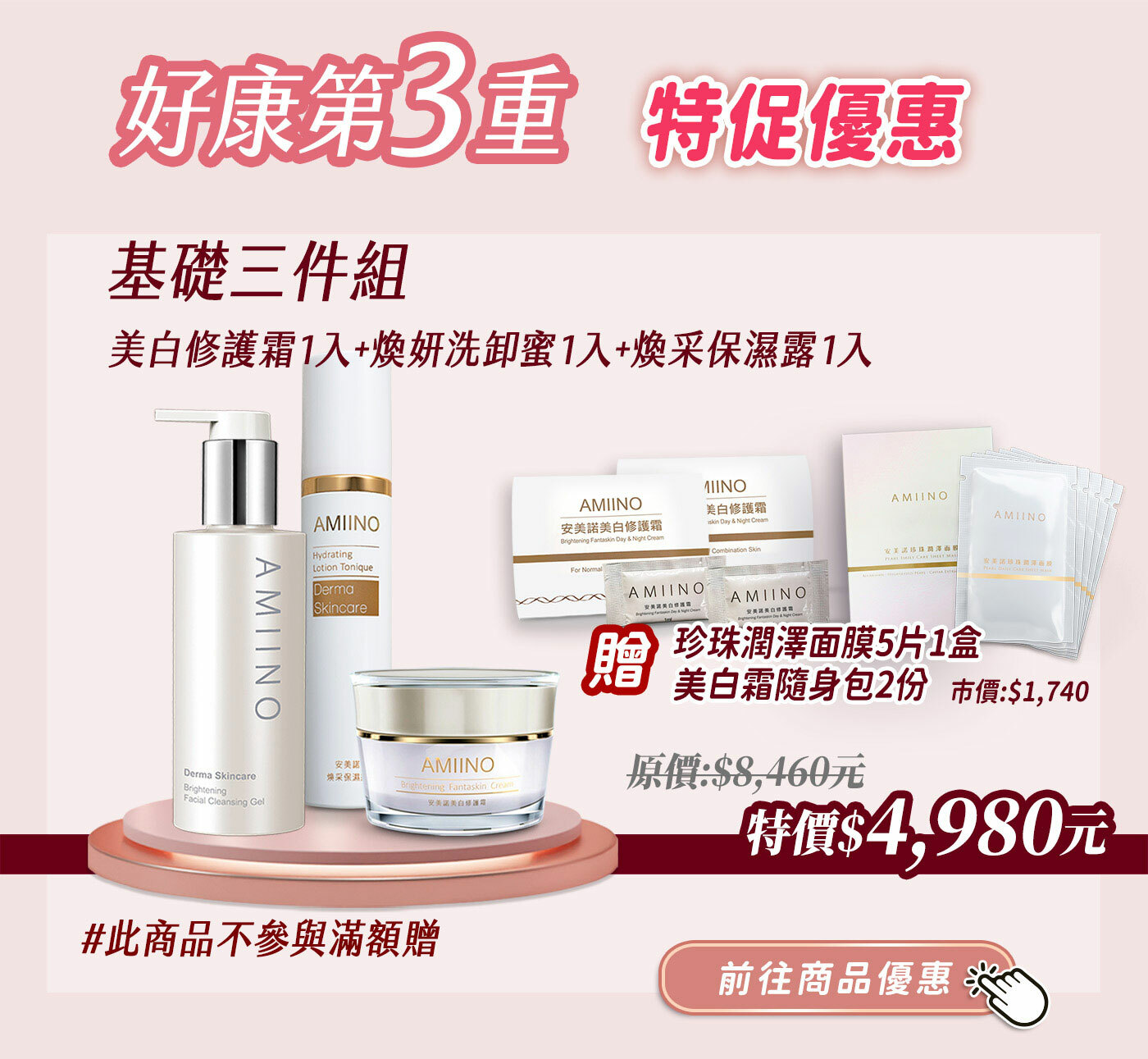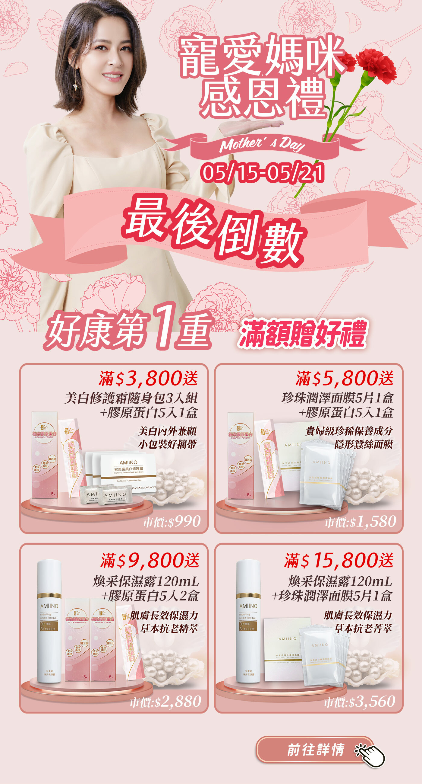 ※滿額送好禮:$3,800送美白修護霜隨身包3入組+膠原蛋白5入1盒、$5,800送珍珠潤澤面膜5片/盒+膠原蛋白5入1盒、$9,800送煥采保濕露120mL+膠原蛋白5入2盒、$15,800送煥采保濕露120mL+珍珠潤澤面膜5片/盒。