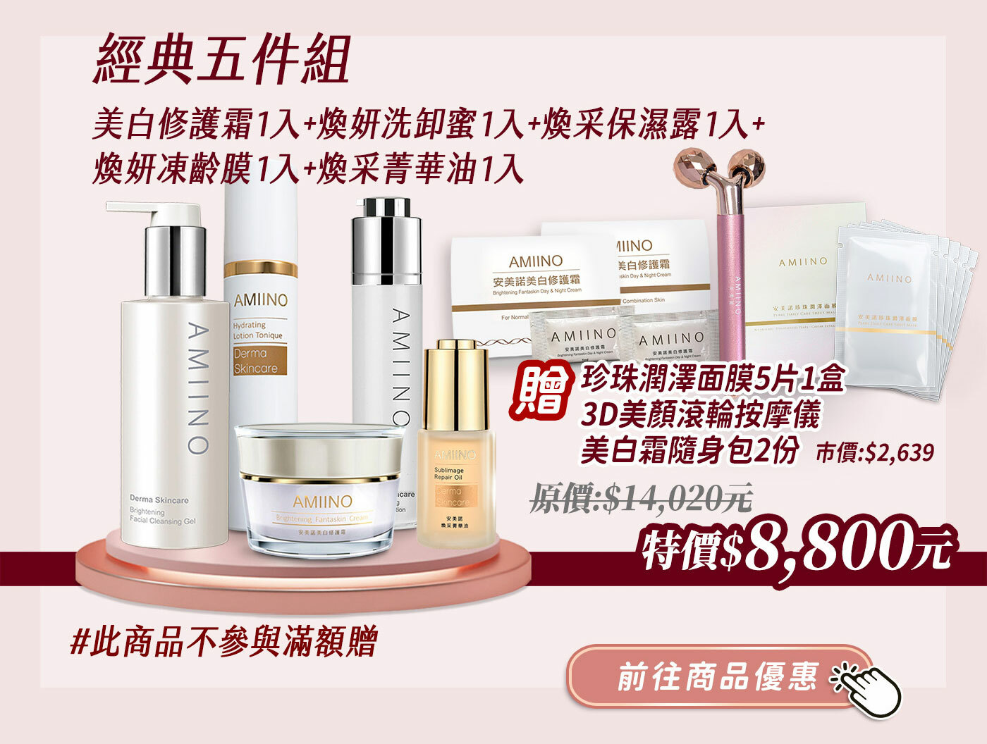 二、經典5件組送珍珠潤澤面膜5片/盒+美白隨身包2份+滾輪按摩儀(不參與滿額贈、贈品有限售完為止)