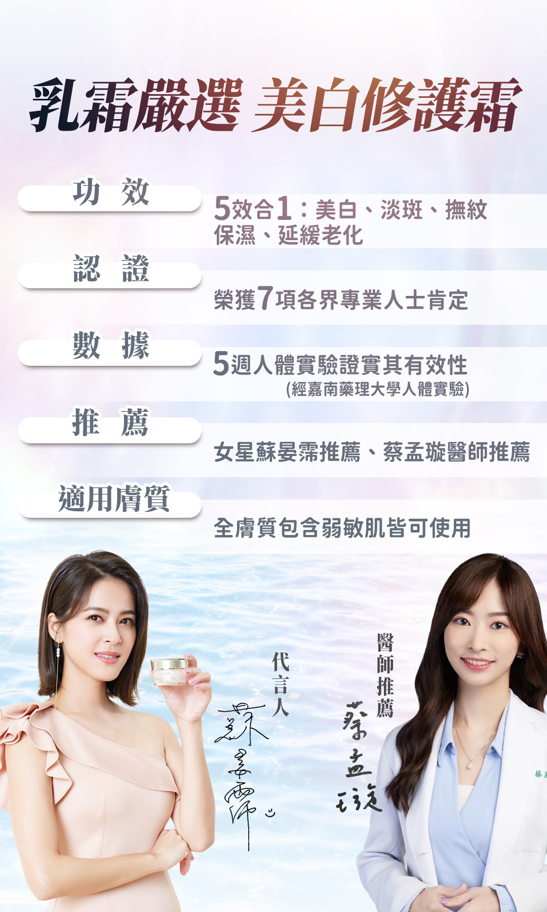 | 用途 | 含有珍珠粉及淨白六胜肽等多種複方精華,經實驗證實有效減少皺紋、斑點、紋理及緊緻毛孔。 |